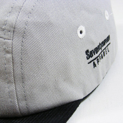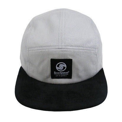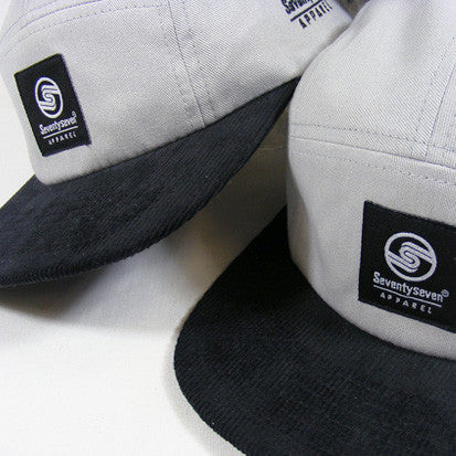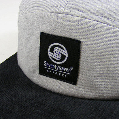 Silver grey drill cotton crown with contrast white side eyelets and black cordorouy bill and underbill. Black & white branded woven emblem on front panel with contrast text embroidery on side panel.