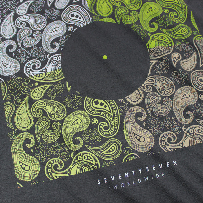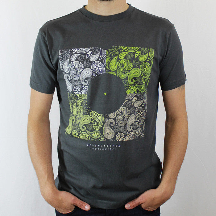 Custom made premium 100% cotton t-shirt with vinyl record cover style 'Paisley Sleeve' 4 colour chest print design from Seventyseven.