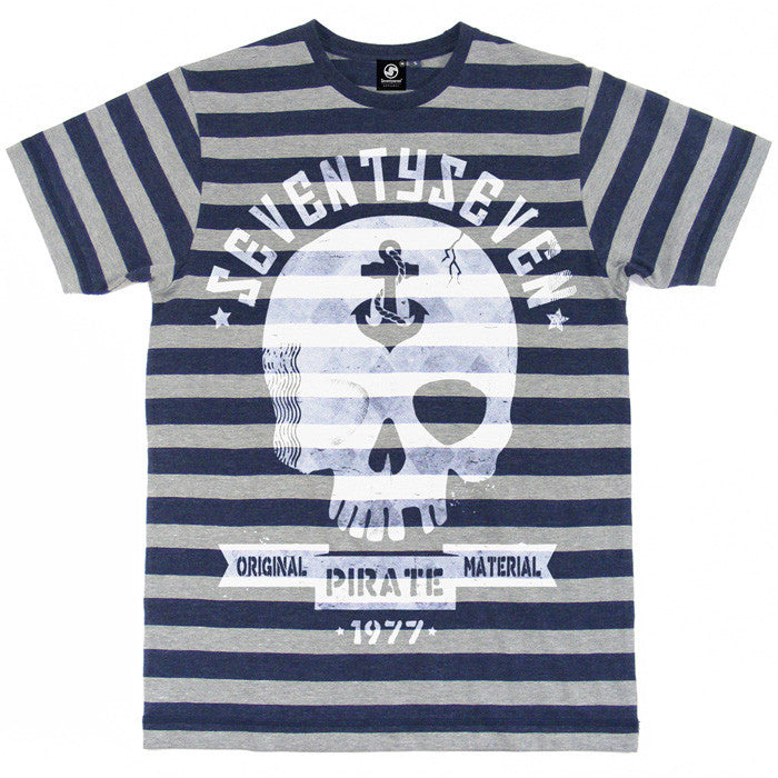 Custom made premium 70/30 cotton poly striped t-shirt with single colour distressed 'Pirate Radio' chest print from Seventyseven. New version of a best selling print.