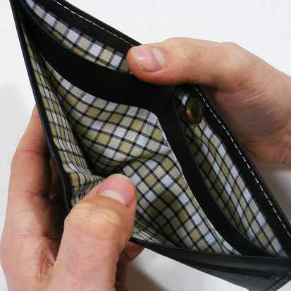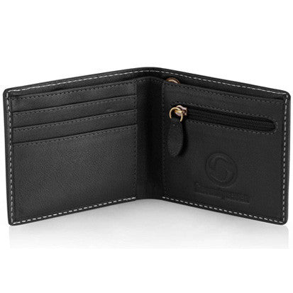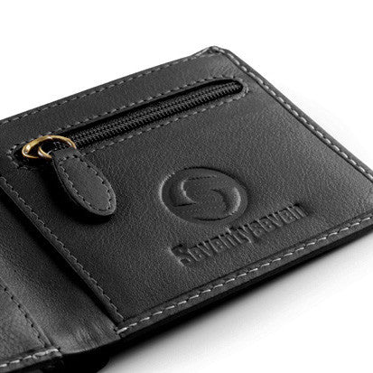 Low profile single fold design with contrast cream stitch detail & custom check lining. Features single zipper pocket, twin bank note sections, x3 credit card clots, antique key chain eyelet & debossed logo details.